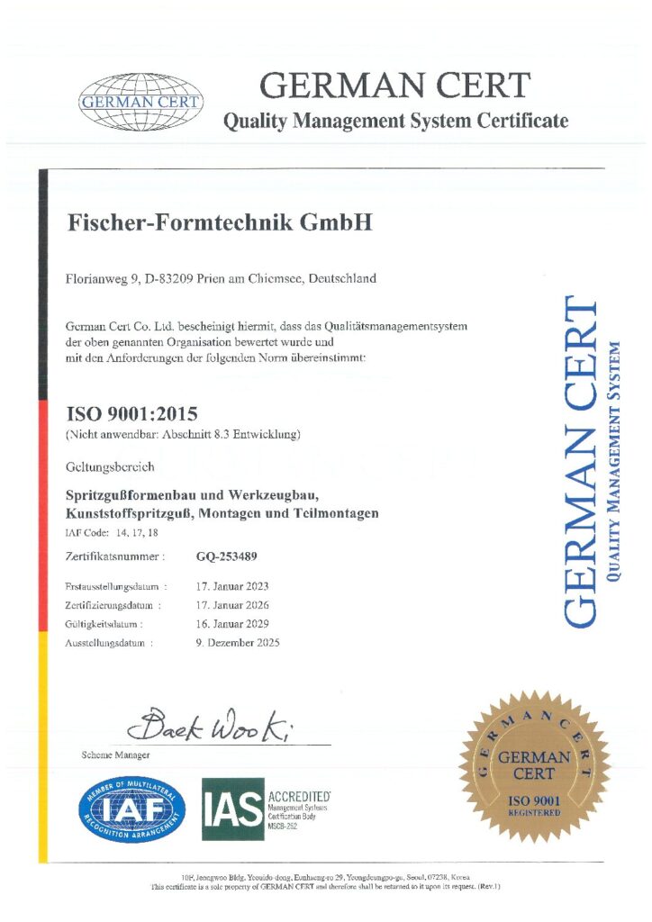Mit der Zertifizierung nach ISO 9001:2015 wurde bei der Fischer Formtechnik GmbH die Basis für Effizienz und Reaktionsschnelligkeit geschaffen. Sämtliche betriebs- und prozessorientierten Vorgänge werden nicht nur dokumentiert und archiviert, sondern auch im Hinblick auf Optimierungsmöglichkeiten ausgewertet – Optimierungen, die vor allem Ihnen, unseren Kunden, zugutekommen.